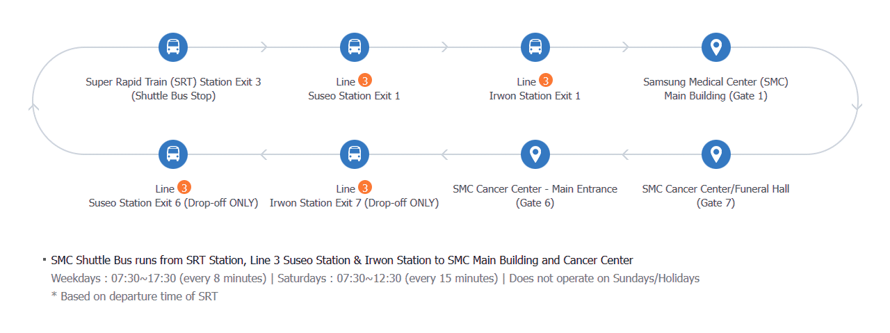 - Local Bus : Gangnam 01(G), SMC Gate1 > SMC Gate 7 > SMC Gate 6 > Daecheong Station(Subway Line 3) > Samseong Station (Subway Line 2), 06:00 ~ 23:30, at approx. 6-minute intervals